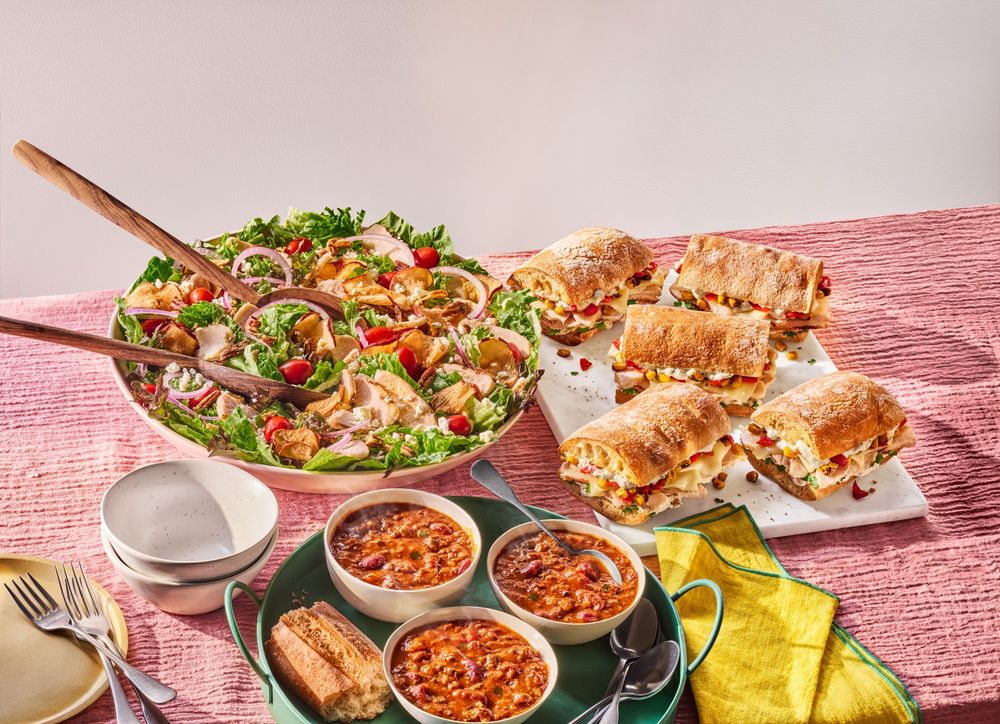 A meal to feed the whole family. Includes 4 Half Sandwiches, 1 Whole Salad, 1 Quart of Soup, and 1 Whole French Baguette. Serves 4-6.